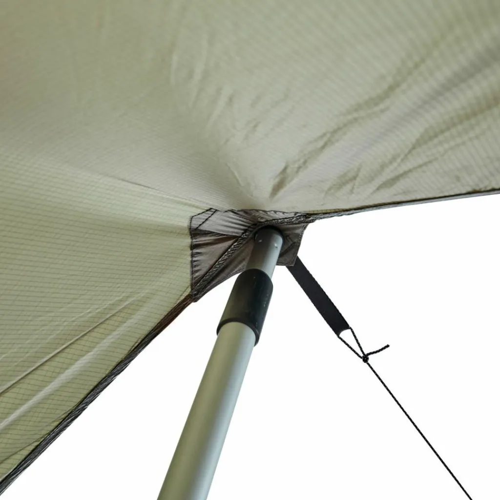 Das leichte Tarp mit Minimalschnitt ist klein im Packmaß und daher optimal für Trekkingtouren geeignet. Es lässt sich gut mit Trekkingstöcken, Tarpstangen oder nur mit Schnüren abspannen.