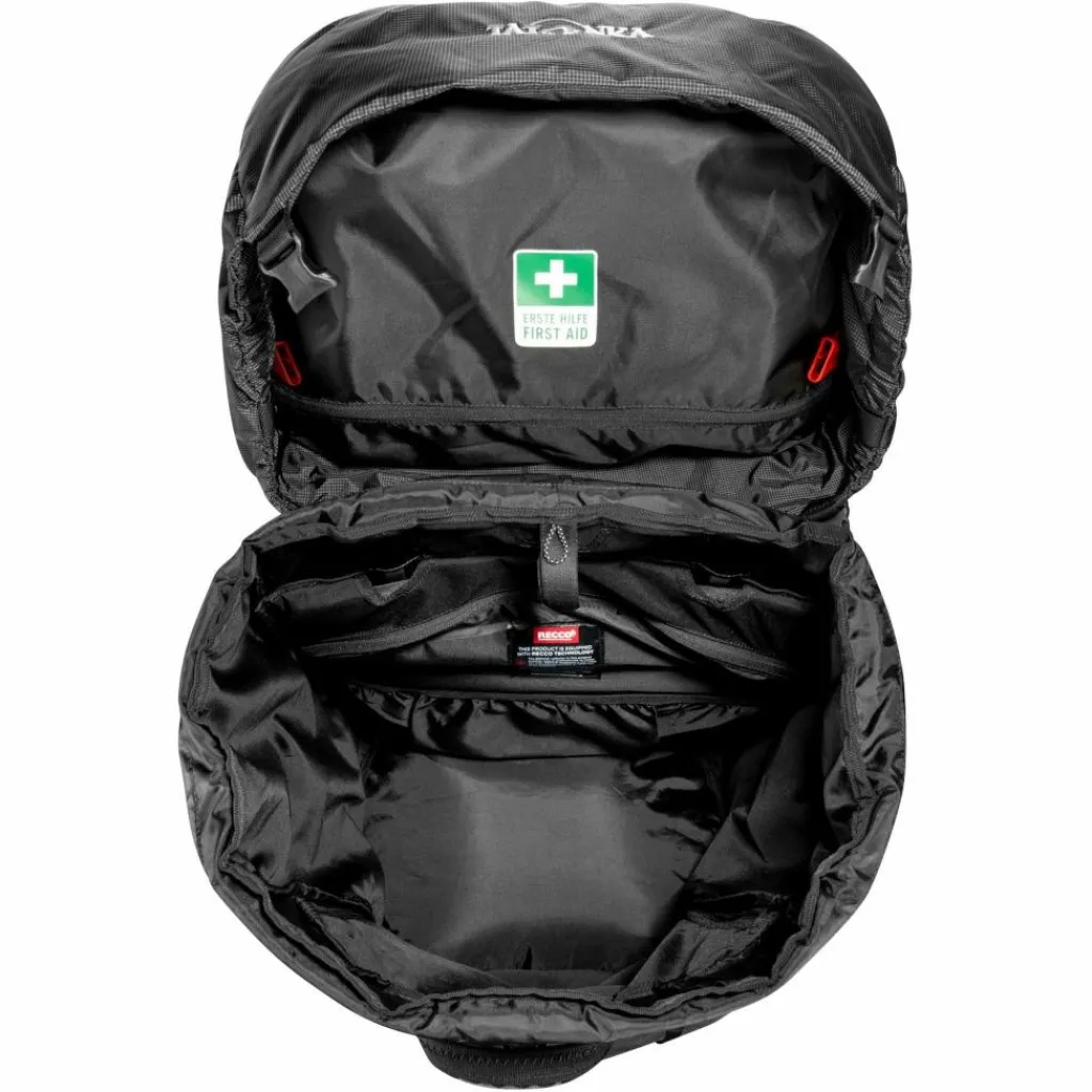 Auf dem Deckel des großen Trekkingrucksacks hat Tatonka einen RECCO-Reflektor angebracht, der Wildnis-Trekkern ein äußerst sinnvolles Sicherheitsfeature für den Notfall bietet. Er ermöglicht Rettungsorganisationen bei der Vermisstensuche in großen Arealen und unübersichtlichem Gelände die schnelle Ortung per RECCO-Helikopter-Detektor. Der Reflektor funktioniert immer, benötigt weder Strom noch Batterien und muss nicht gewartet werden.