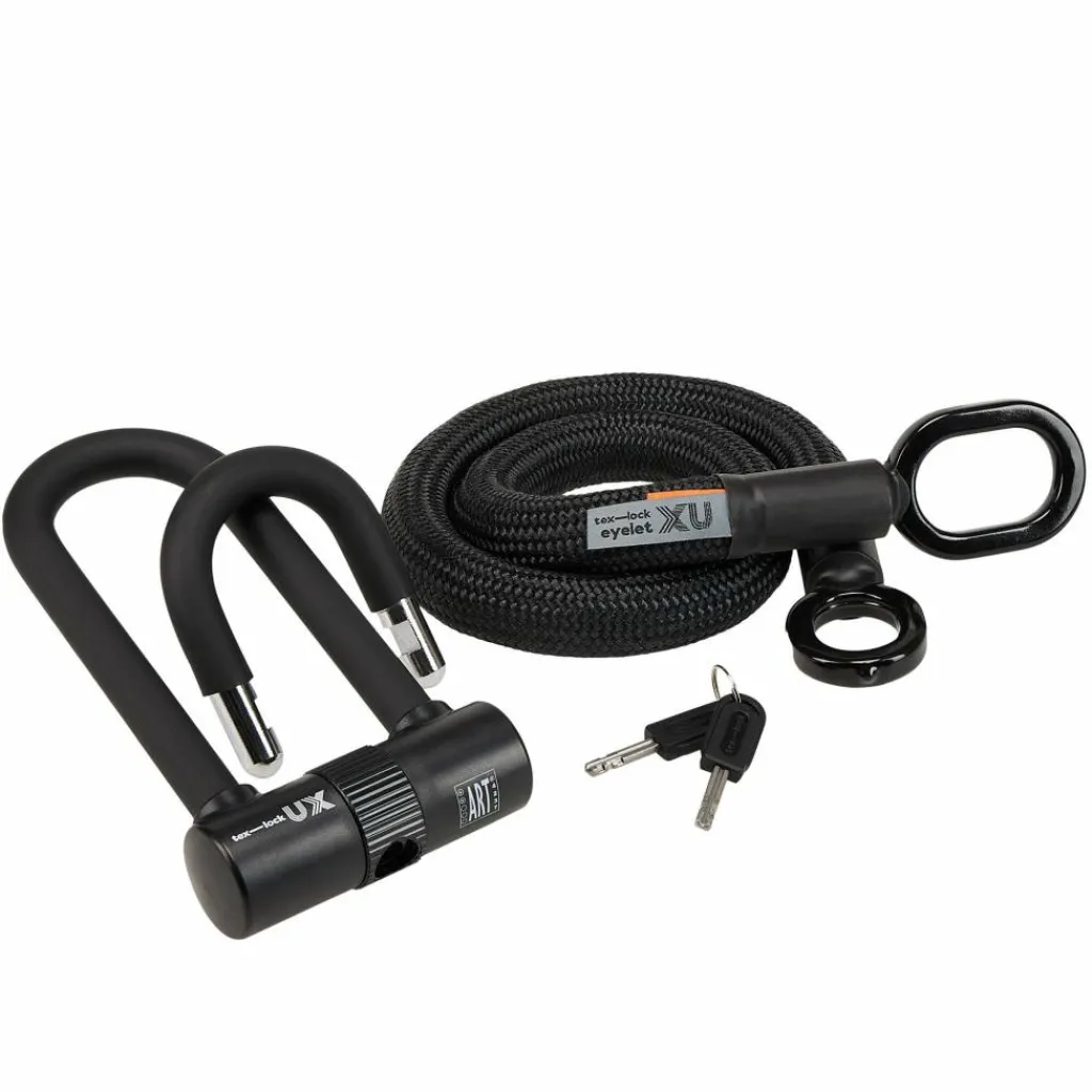 Praktische Kombi aus Eyelet und Bügelschloss; 2 verschieden lange Bügel sind inklusive. Das Eyelet hat eine angenehm textile Ummantelung. Dank Metallkern ist es resistent gegen Zerstörungsversuche.
