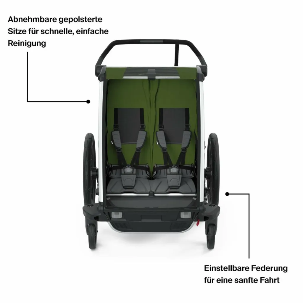 Der Chariot Cab ist mit zwei separat verstellbaren Liegesitzen ausgestattet. Einer der Sitze hat eine höhere Sitzhöhe für ältere Kinder. Zudem ist der Anhänger insgesamt etwas breiter konzipiert. Einstellbare Lüftungsöffnungen, Regen- und Sonnenschutz sowie ein Fliegengitter schützen die Kids in allen Fahrbedingungen. So wird jedem Passagier der bestmögliche Komfort geboten.