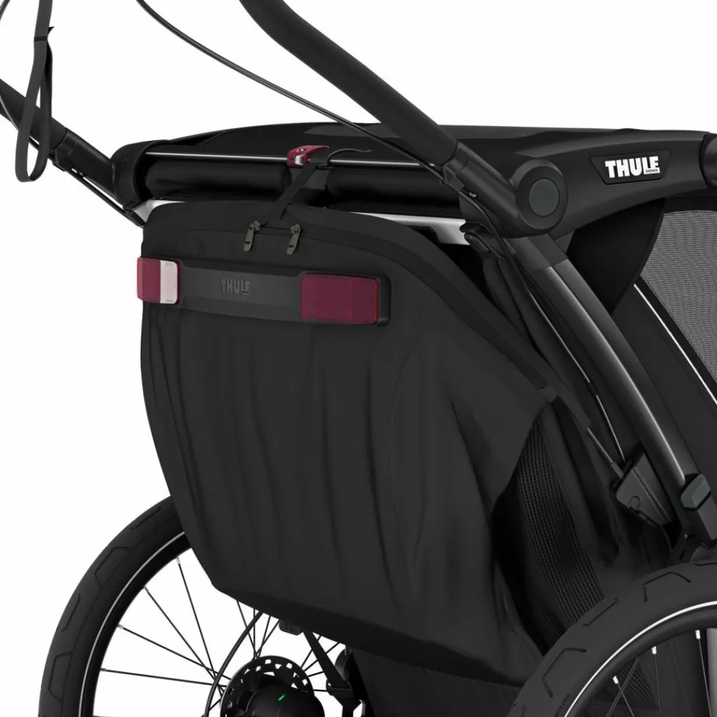 Spielzeug, Einkäufe oder Picknickutensilien – im großen, separaten Staufach kannst du dein Gepäck gut erreichbar unterbringen. Das Fach ist mit einem Reißverschluss verschlossen und bringt ausreichend Eigenstabilität mit: Der feste Boden sorgt dafür, dass der voll beladene Stauraum nicht ausbeult. Fürs Joggen kannst du das Staufach hochklappen, um die nötige Beinfreiheit zu erhalten. (Der Kindersitz muss dafür in die aufrechte Position gebracht werden.) Integrierte Reflektoren runden das Staufach ab.