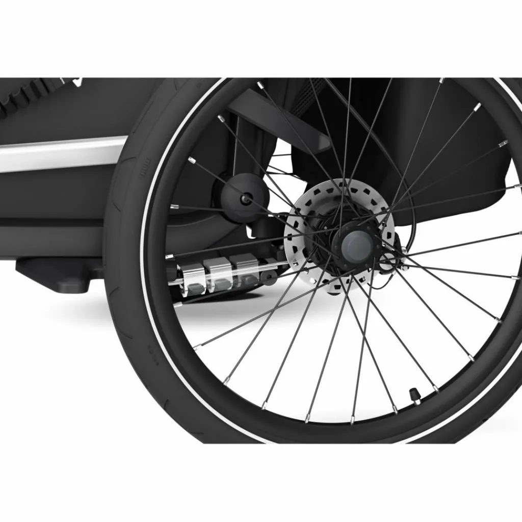 Was ihn von den anderen Thule Kindertransportern unterscheidet, ist vor allem die effektive, von Hand bedienbare Scheibenbremse, die den Chariot Sport 2 Single absolut geländetauglich macht, sowie der komfortable, gut ventilierte Innenraum mit Komfort-Sitz. Zwei Lüftungsöffnungen unterhalb der Frontrückstrahler sorgen für den angenehmen Luftaustausch während der Fahrt.