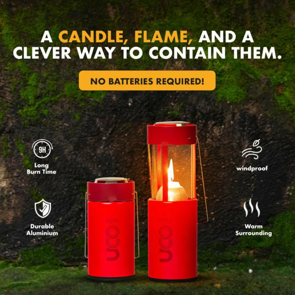 Die UCO-Kerzenlaterne bringt seit Dekaden ein stimmungsvolles Licht in die Camps dieser Welt. Für den Transport kann der Glaszylinder versenkt werden und wird so durch den Aluminiumkörper geschützt.