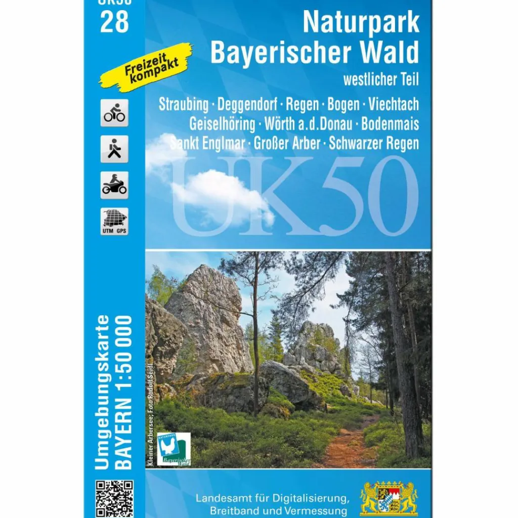 Die amtliche Reihe der UK50 (Umgebungskarte 1:50000) bietet für zusammenhängende bayerische Regionen gezielte Freizeitinformationen. Kartengrundlage ist die TK50 (Topographische Karte 1:50000) mit UTM-Gitter für GPS-Nutzer und Geländedarstellung. In der UK50-28 wird der westliche Teil des Naturparks Bayerischer Wald präsentiert. Die Landschaft ist sehr vielseitig: schöne Täler entlang der Donau, tolle Hügellandschaften im Falkensteiner Vorwald und die Berge im Bayerischen Wald. Radwege entlang der Donau und rund um Straubing sowie im Naturpark lassen keine Wünsche offen.