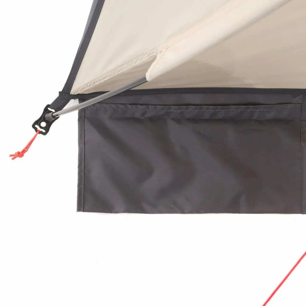 Möchtest du ins Wasser springen, kannst du den Eingang mit der Bodenplane verschließen. So liegen die Sachen sichtgeschützt im Innern der Strandmuschel. Seitlich angebrachte Taschen können derweil mit Sand oder Steinen gefüllt werden, damit Speedy nicht vom Wind davongetragen wird.