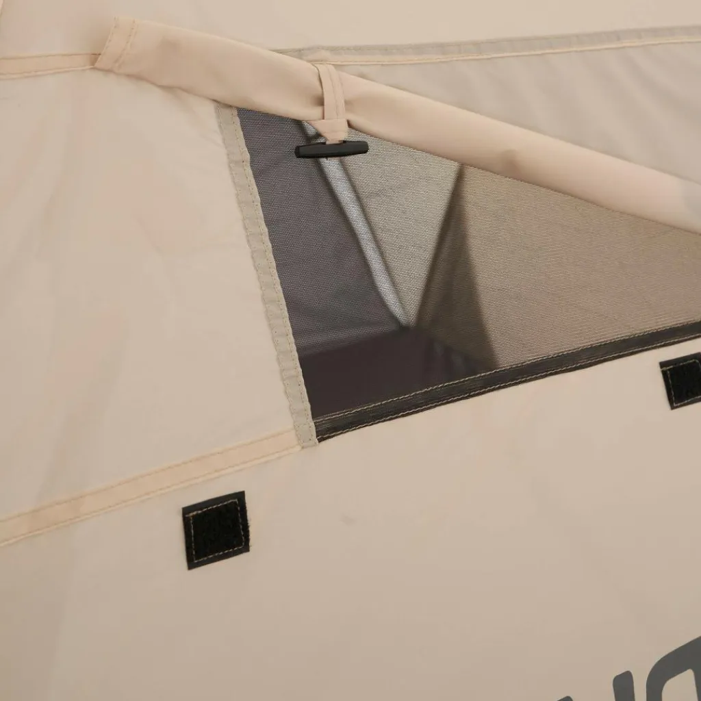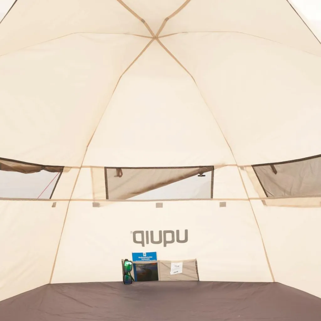 Die große Bodenplane bietet genug Liegefläche für zwei Personen. Drei verschließbare Fenster belüften die Strandmuschel und in den Seitentaschen kannst du Kleinkram unterbringen, damit nichts im Sand liegen bleibt.