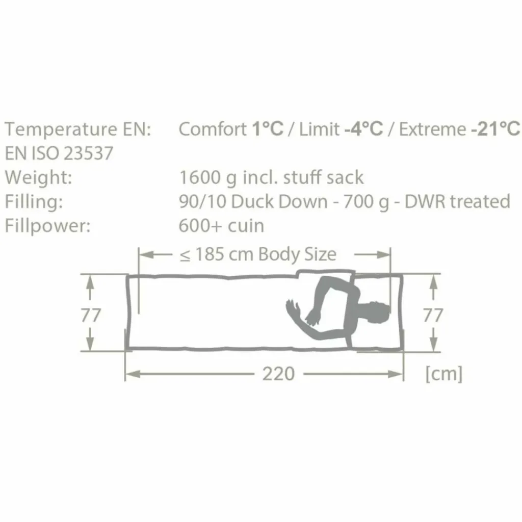 Die Vorderseite des Alpsee 700 Down lässt sich umklappen, wodurch der Schlafsack wie eine Decke aufgeschlagen werden kann. Der umlaufende Reißverschluss erlaubt die Nutzung als vollwertige Decke. Voll entfaltet entspricht er den Maßen einer gewöhnlichen Komfortbettdecke und passt somit in standardisierte Bettbezüge. Dank der Armöffnungen kannst du in kühlen Nächten im Schlafsack sitzen und hast die Hände frei – ideal für Lesenächte unter freiem Himmel oder gesellige Abende am Tisch.