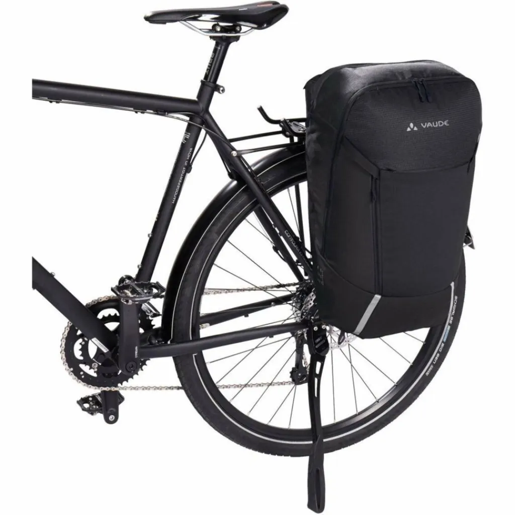 Die Cycle 20 II wird über die mit einem Schloss absperrbaren QMR-Haken (z. B. Abus 145/20, nicht im Lieferumfang enthalten) am Gepäckträger befestigt und ist im Handumdrehen zum Rucksack umgebaut. Dazu werden die beiden vertikalen Reißverschlüsse geöffnet und das gesamte Befestigungssystem in einem mit Klett verschlossenen Fach verstaut. Die Umbaufunktion wird auf einem eingenähten, leicht entfernbaren Etikett in wenigen Schritten erläutert. Die clevere Rucksack-Radtaschen-Kombination bietet aber noch mehr. Im großen Hauptfach mit Platz für DIN A4 Unterlagen hilft ein mit Reißverschluss zu schließender Netz-Organizer für Kleinutensilien dabei, Ordnung zu halten. Ein separates, mit Reißverschluss verschlossenes, gepolstertes Fach nimmt Laptops bis 15,6 Zoll auf. Auf der Front befindet sich eine flache Netztasche für das schnelle Verstauen von Zeitschriften oder nasser Kleidung. Ein Helmhalter sowie ansprechend ins Design integrierte reflektierende Elemente runden die Komfortausstattung ab. Das Hauptmaterial des Cycle besteht aus 50 % recyceltem Polyester, das Kontrastmaterial sogar zu 100 %. Unser Verwandlungskünstler ist mit EcoFinish PFC-frei wasserabweisend ausgerüstet. Das VAUDE Green Shape-Label steht für ein umweltfreundliches, funktionelles Produkt aus nachhaltigen Materialien.
