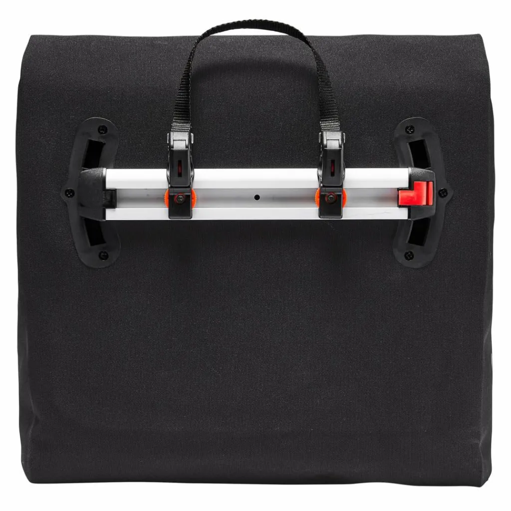 Die Tasche kommt mit einer abnehmbaren QMR-Schiene. Mit den QMR-Haken (Quick Mount Release) lässt sich die Tasche sicher am Gepäckträger befestigen. Nutzt du die Augsburg IV L anschließend als Umhängetasche, nimmst du die QMR-Schiene samt Haken einfach ab. Danach ist der Taschenrücken glatt; es drückt nichts unangenehm, wenn du die Augsburg IV L als Umhängetasche an der Seite trägst.