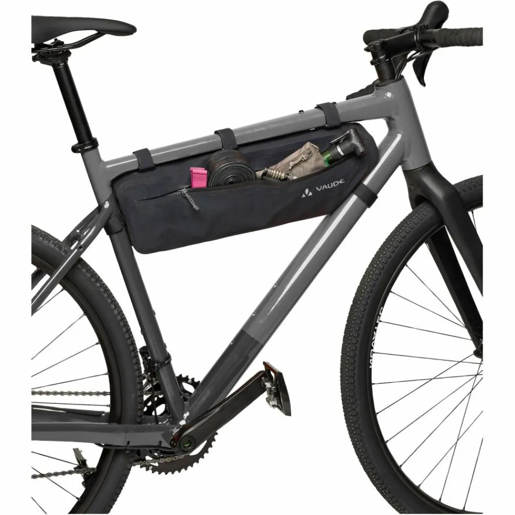 Die Trailframe L ist perfekt fürs Bikepacking geeignet und kann mit der Vaude Trailframe M Tasche kombiniert werden. Die Rahmentasche besteht überwiegend aus recycelten Materialien (64 % Polyamid ist recycelt, 100 % Polyester ist recycelt).