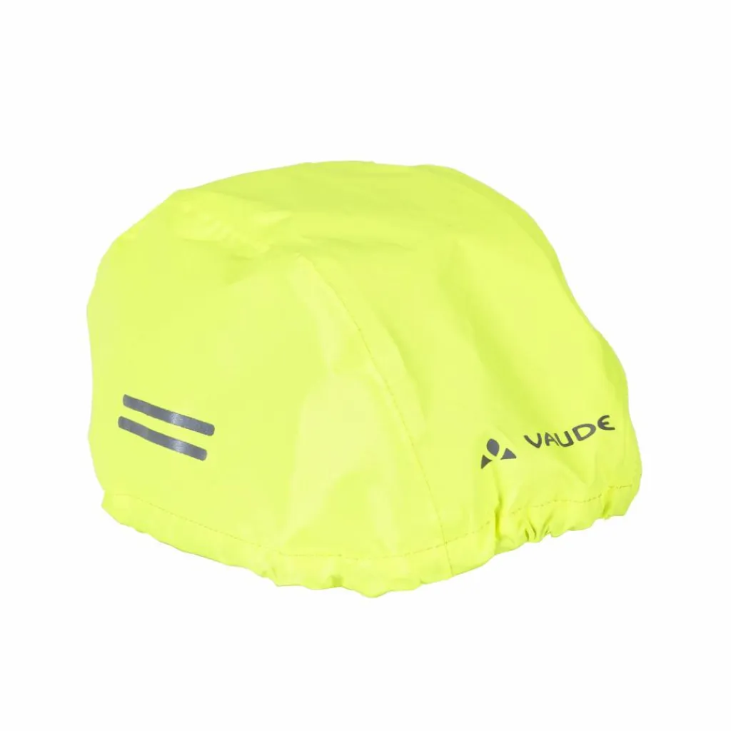 Wasser- und winddichter Helmüberzug in auffälliger Farbe mit reflektierenden Elementen. Der Überzug lässt sich per Kordelzug im Umfang anpassen.