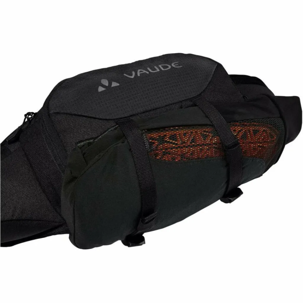 Das hintere Fach bietet über die komplette Breite genügend Platz für Regenjacke und Ersatzschlauch. 2 kleine, mit Reißverschluss verschlossene Seitentaschen schmiegen sich perfekt um den Hüftbereich und verwahren Minitool, Handy oder Riegel. Ein auf die Front aufgesetztes Fach ermöglicht gute Organisation des Werkzeugs. Am Boden der sportlichen Hüfttasche lassen sich sowohl eine Minipumpe als auch vor der Ausfahrt Protektoren befestigen. Eine Regenhülle für Schutz vor Schauern und Schmutz sowie ein reflektierender Webbingloop und das reflektierende Vaude Logo runden dieses Komfortpaket mit 3 l Volumen ab.