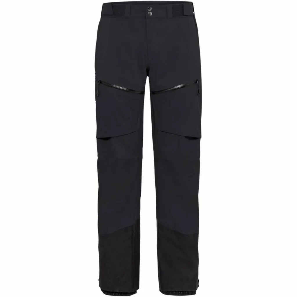 Der Bund ist weitenverstellbar und mit Gürtelschlaufen versehen, der Rückenteil etwas höher geschnitten, damit auch mit angezogenen Beinen am Fels oder in gebückter Haltung keine Kältebrücke entsteht. Die beiden Beintaschen mit wasserdichtem Reißverschluss verwahren Handy, Mütze oder den Müsliriegel und sind auch bei angezogenem Klettergurt gut erreichbar. Der Beinabschluss ist großzügig mit robustem, schnittfestem Material verstärkt, die Innengamaschen schützen vor eindringendem Pulverschnee bei der Abfahrt und die Verstellung am Beinabschluss passt über jeden Skitourenstiefel.