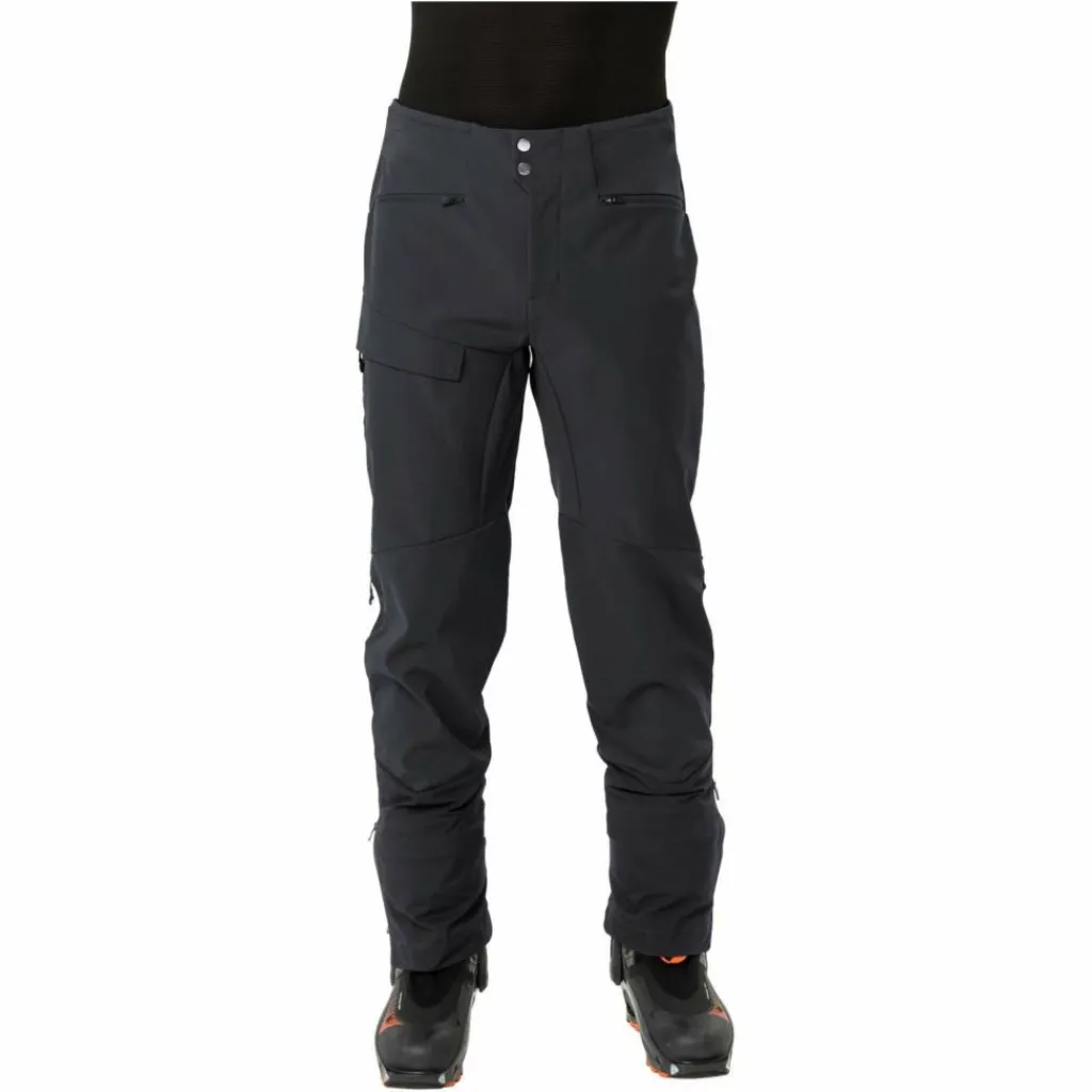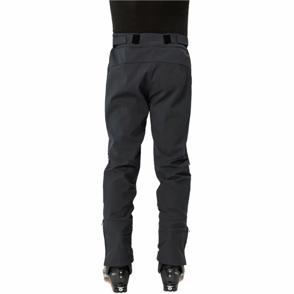 Lange, mit Mesh hinterlegte Ventilationszipper an den Seiten sorgen im Aufstieg für eine effiziente Belüftung, ohne dass Schnee eindringt. Die verstärkten Beinabschlüsse gehen auch bei Kontakt mit Fels, Skikanten oder Steigeisen nicht gleich in die Knie, während eine innenliegende Gamasche Eis und Schnee draußen hält. Zudem ist die Herren Softshellhose voll alpintauglich: Beim Tragen eines Klettergurts stört der flache, mit Klett verstellbare Bund genauso wenig wie die angeschrägten Seitentaschen. Eine zusätzliche Beintasche bietet Platz für LVS, Smartphone, Topo-Karte oder die Mütze.
