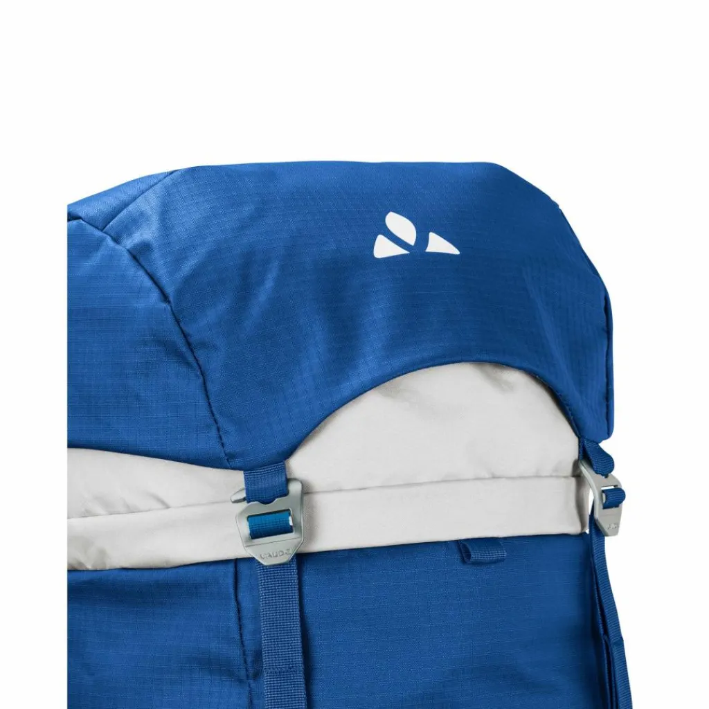 Die ergonomisch geformten Schulterträger bieten in der FoM-Variante (Freedom of Movement) einen uneingeschränkten Bewegungsradius – auch über Kopf wie z.B. beim Klettern. Dafür sorgen zwei separat einstellbare und abnehmbare Brustgurte, die die Träger bei Bedarf weit nach innen ziehen und so das Schultergelenk maximal freigeben. Der Alurahmen lässt sich anpassen oder herausnehmen. Unter dem höhenverstellbaren Deckel (etwa 5 l Extra-Volumen) verbirgt sich die Seilhalterung. Außen am Alpinrucksack lassen sich zwei Eisgeräte und der Helm befestigen. Seitliche Holster und die Kompressionsriemen geben Ski oder Trekkingstöcken Halt. An zwei Gurtbänder mit Schlaufen kann weitere Ausrüstung fixiert werden.