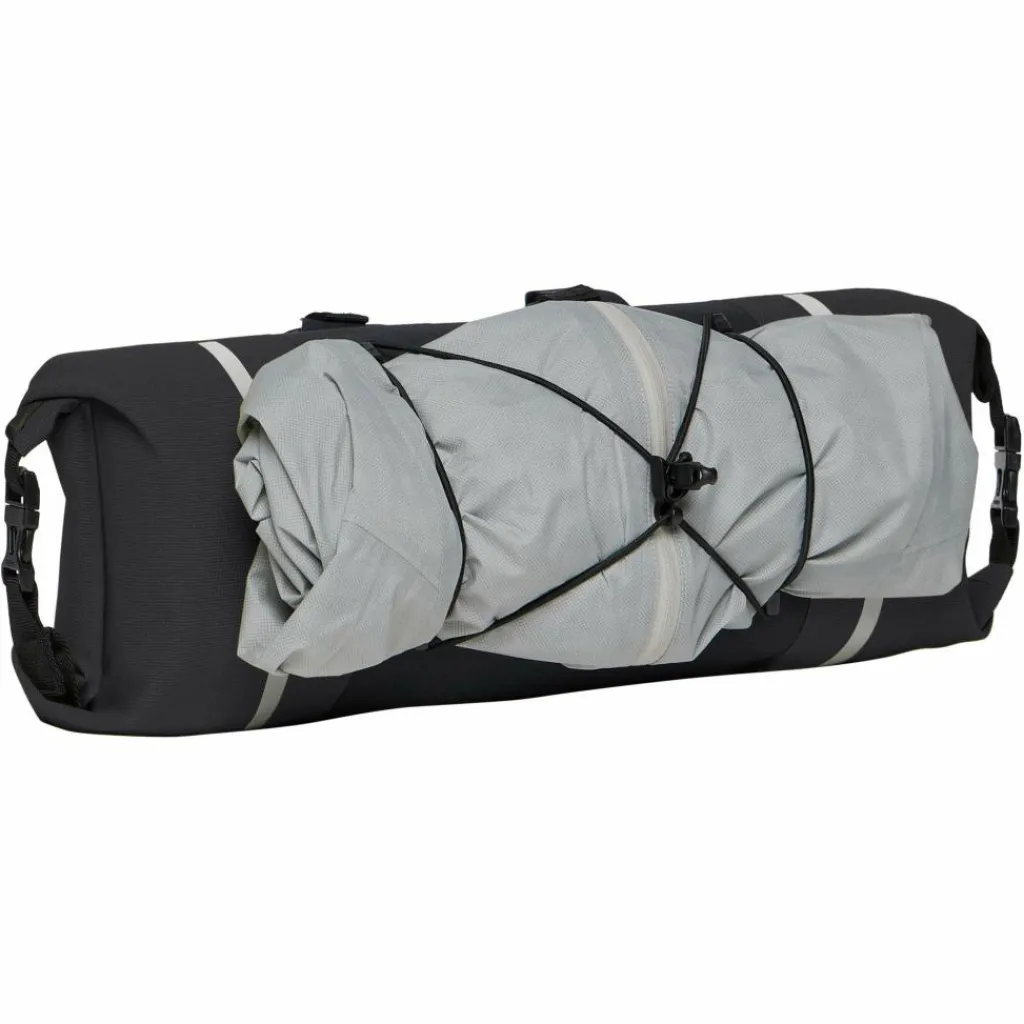 Die wasserdicht verschweißte Lenkerrolle Trailfront Compact sorgt für ein unbeschwertes Touren-Wochenende. Die Lenkerrolle mit 6,2 Litern Volumen ist von beiden Seiten zugänglich und über Wickelverschlüsse wasserdicht komprimierbar und eignet sich hervorragend für leichtes Gepäck oder einen Schlafsack. Über Packriemen auf der Oberseite kannst du zusätzliches Gepäck und sogar ein Zelt außen befestigen. Die Klettfixierungen machen ein schnelles, dabei sehr stabiles Anbringen am Lenker möglich. Die variabel einstellbare Elastikkordel hält alles fest, was schnell greifbar sein soll.
