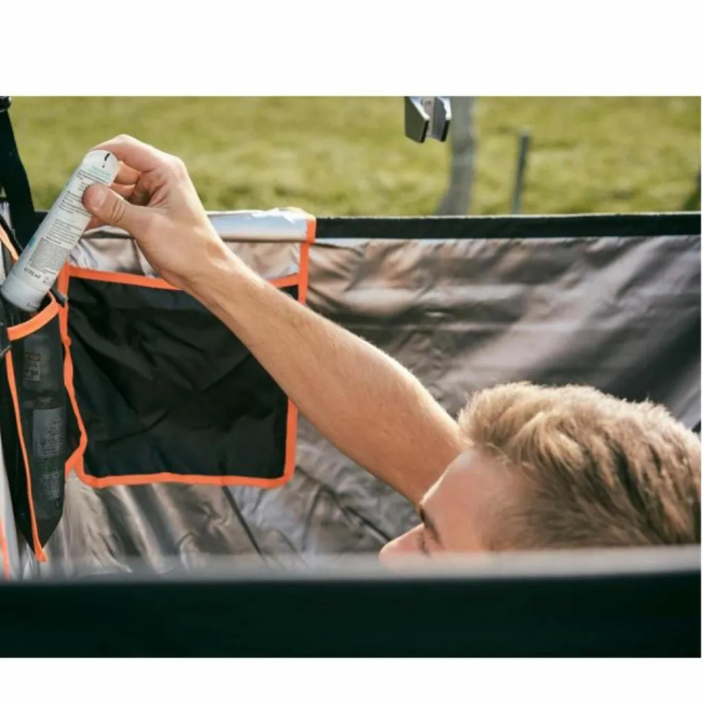 Im Oberen Bereich findest du eine Vorrichtung, an der du einen Wasserbeutel oder eine Outdoor-Dusche aufhängen kannst. Nach unten hin ist das Duschzelt übrigens offen, so kann das verwendete Wasser im Boden versickern. Deine Waschsachen wie Duschgel oder Seife kannst du in seitlichen Taschen unterbringen. So brauchst du sie nicht auf dem schmutzigen Boden abzulegen.