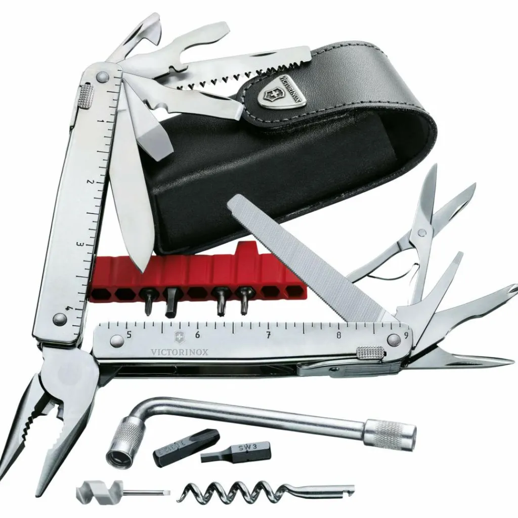 Das Swiss Tool X Plus ist ein großes und vielseitiges Multitool. Zum Lieferumfang gehört neben dem Tool auch ein Bit-Set mit Bit-Schlüssel und ein Lederetui, in dem alle Teile verstaut werden können.