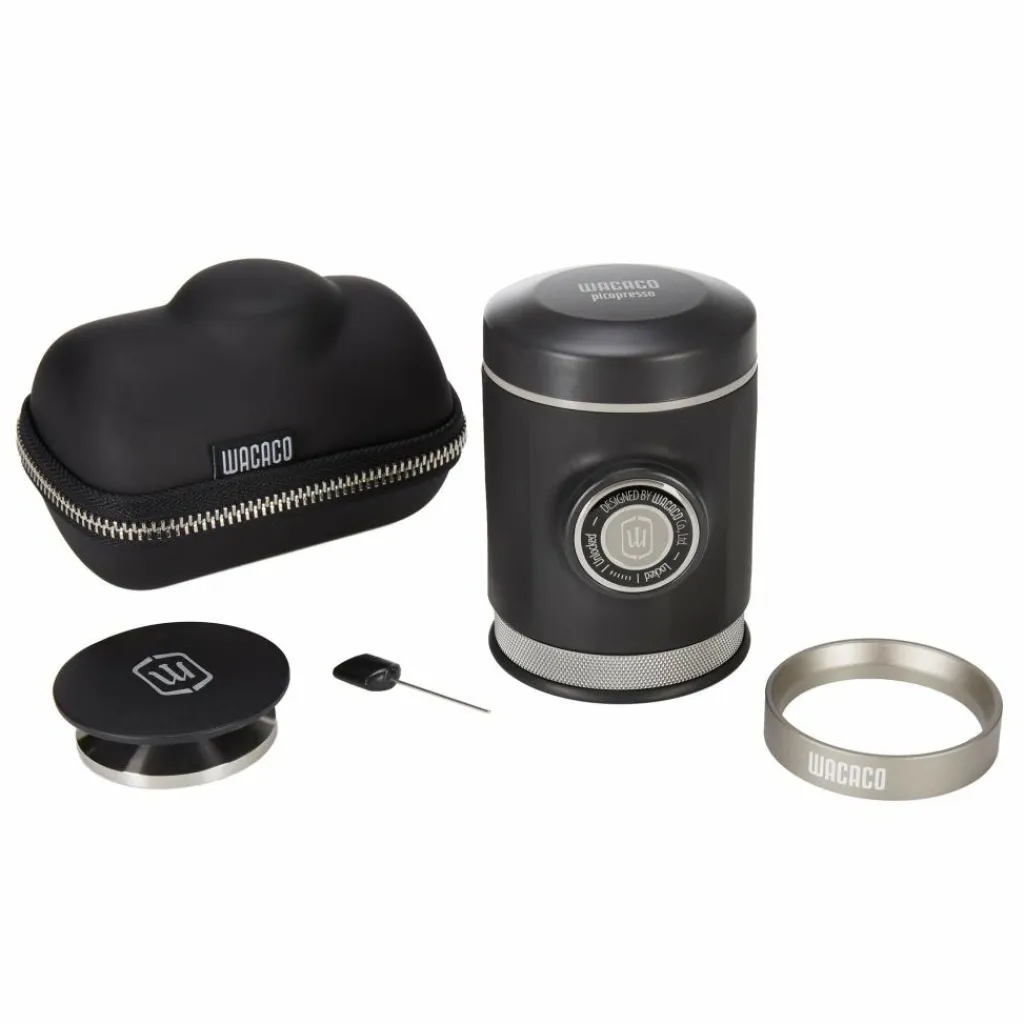 Eine Picopresso besteht aus: Wassertankdeckel, Trichter, Wassertank, Hauptkörper, Kolben, Auslaufdusche, Doppelfilterkorb, Siebträger, Siebträgerkopf, Siebträgerabdeckung. Hinzu kommen Zubehörteile wie Tamper, Messbecher, Verteilwerkzeug, Bürste. Alle Teile (inkl. Zubehör) werden kompakt im Gerät aufbewahrt und nehmen somit nur die winzigen Maße von 10,6 x 7,8 cm an. Um das edle Gerät beim Transport bestmöglich zu schützen, kannst du es im mitgelieferten Etui verstauen.