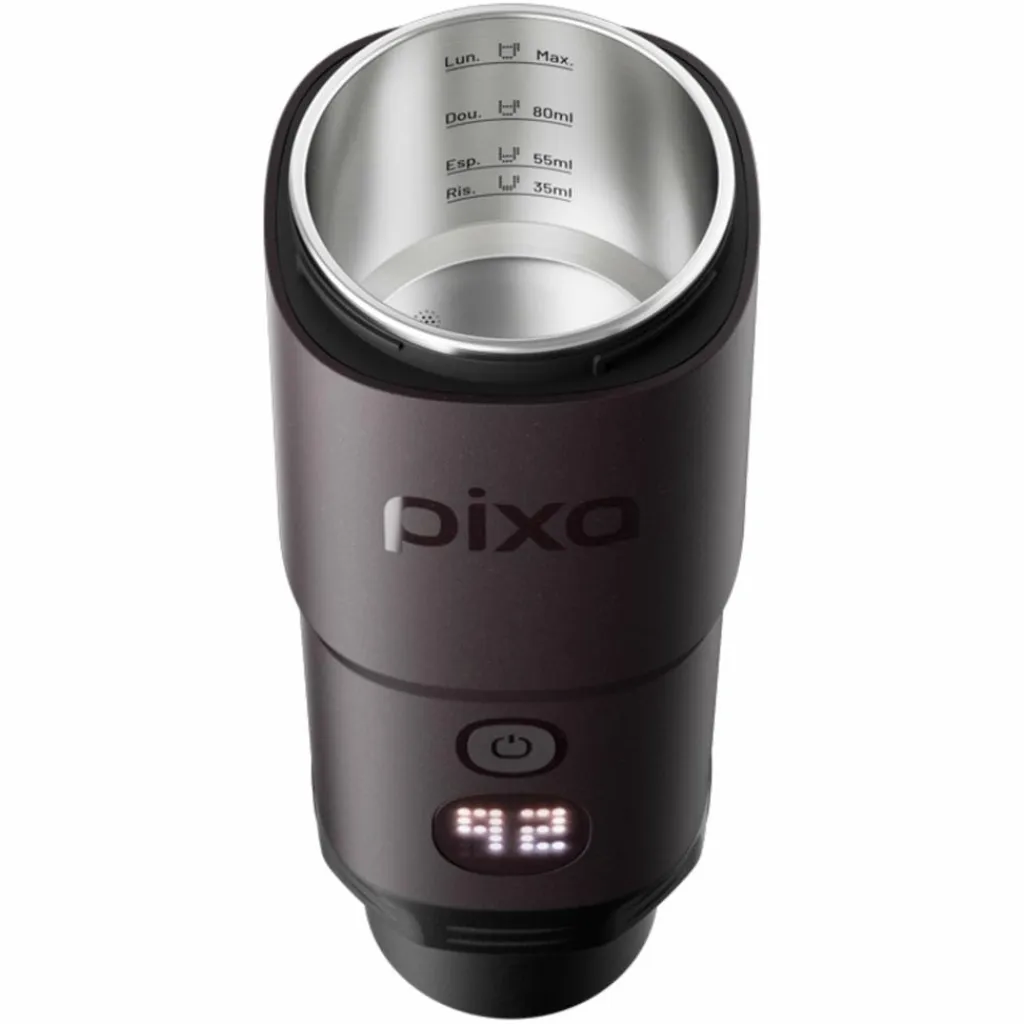 Die Pixapresso ist eine kompakte Akku-Espressomaschine, mit der du dir unabhängig von Steckdose und Küche jederzeit bis zu fünf Espressi mit einer Akkuladung bereiten kannst.