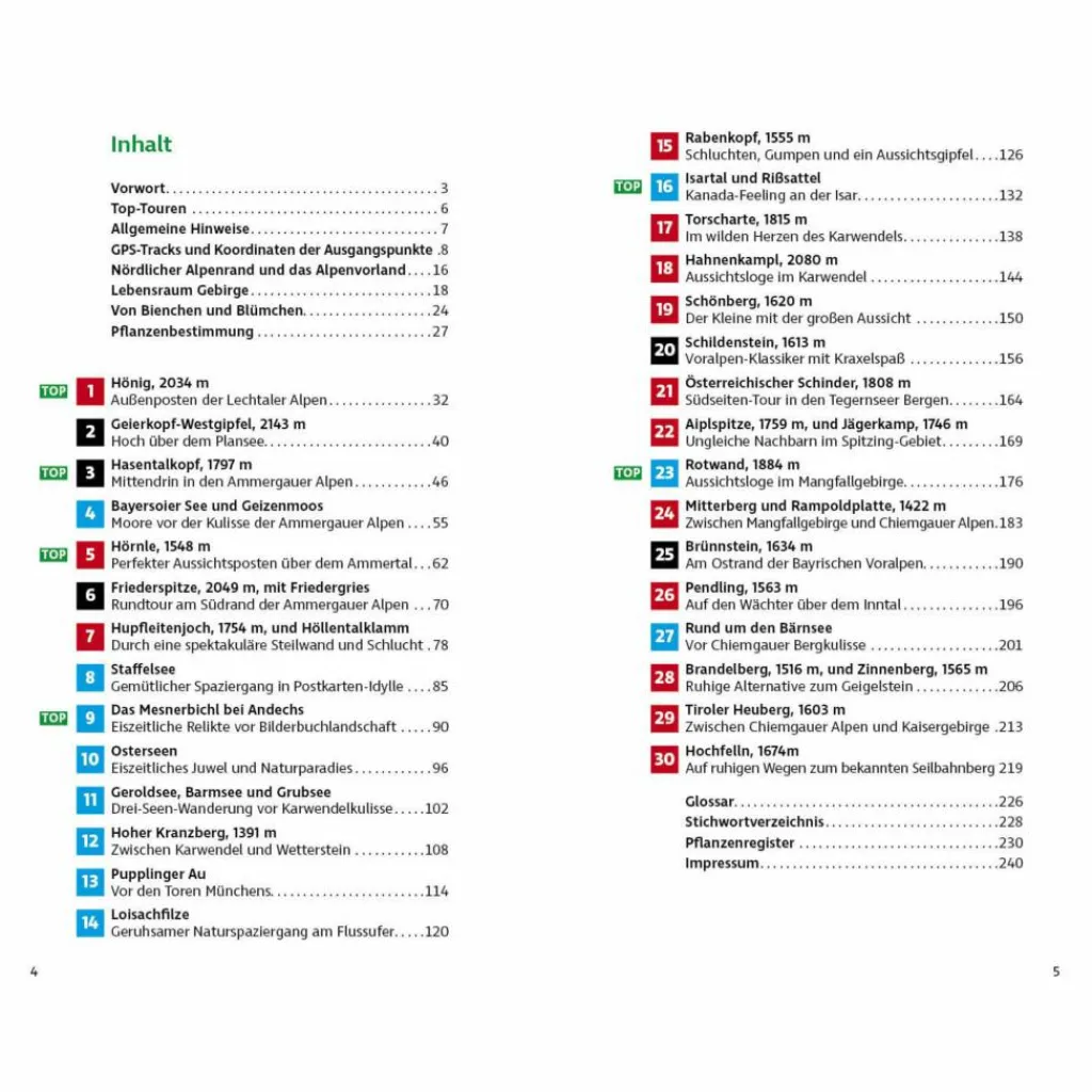 30 blütenreiche Wanderungen führen von den Lechtaler Alpen bis ins Chiemgau und natürlich auch ins bayerische Alpenvorland. Das Landschaftsbild ist also höchst unterschiedlich und weist vielfältigste Lebensräume für Pflanzen auf. Sie reichen von sonnen- und sumpfreichen Bergwiesen bis zu windexponierten und kargen Felsen. Jedes Gebiet beheimatet seine botanischen Spezialisten: Der Einfallsreichtum der Natur, mit dem sich Blumen unter schwierigen Bedingungen im Gebirge behaupten, ist nahezu unbegrenzt.