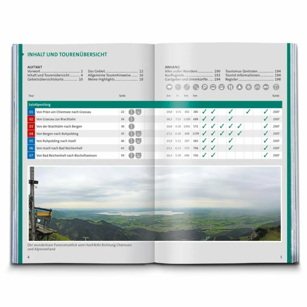 Mit etwa 230 km durchquert man das Chiemsee-Alpenland, den Chiemgau, das Berchtesgadener Land, den Tennengau und schließlich die Welterberegion um den grandiosen Dachstein. Jede Region trägt mit ihrem ganz eigenen Charme zur Vollkommenheit dieses besonderen Projekts bei. Mit atemberaubenden Ausblicken, beispielsweise vom Hochfelln, dem „Aussichtspunkt des Chiemgaus“ oder historisch auf den Spuren des Salzes zwischen Bad Reichenhall, Berchtesgaden und Hallstatt, wird die Schönheit dieser Region wunderbar eingefangen. Die Wege sind allesamt bestens markiert und so abwechslungsreich, dass einem bestimmt nicht langweilig wird