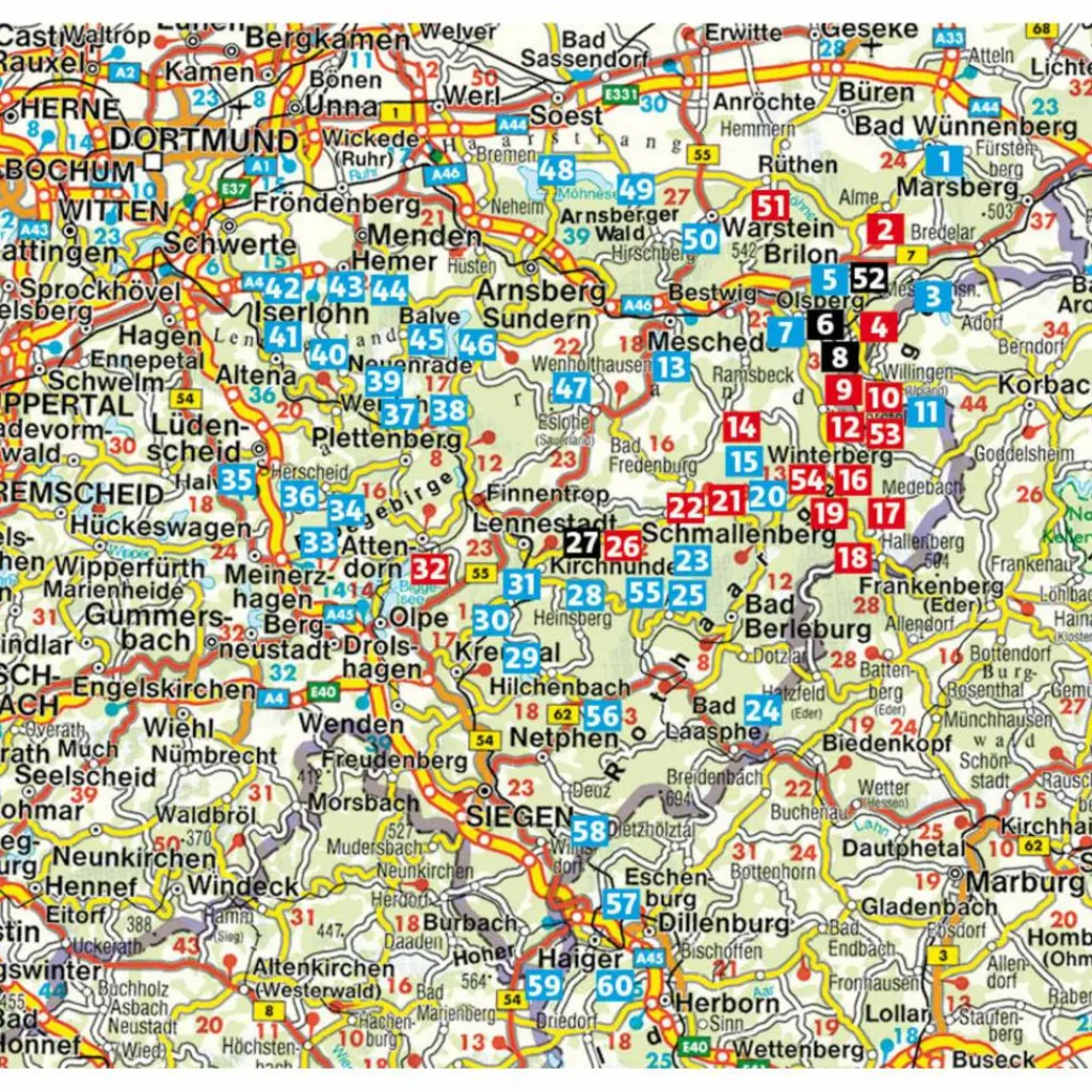 Aussichtsreiche Gipfel, liebliche Bachtäler, schattige Waldpfade: Das Sauerland ist eine abwechslungsreiche, landschaftlich großartige Wanderregion in Deutschlands Westen. Der Rother Wanderführer »Sauerland« stellt die 60 schönsten Wanderungen vor. Vom mühelosen Spaziergang auf der Uferpromenade der zahlreichen Stauseen bis zur eindrucksvollen Bergtour über die höchsten Höhen Westfalens ist für jeden Anspruch die passende Route dabei. Außerdem stellt der Band den kompletten Rothaarsteig vor.