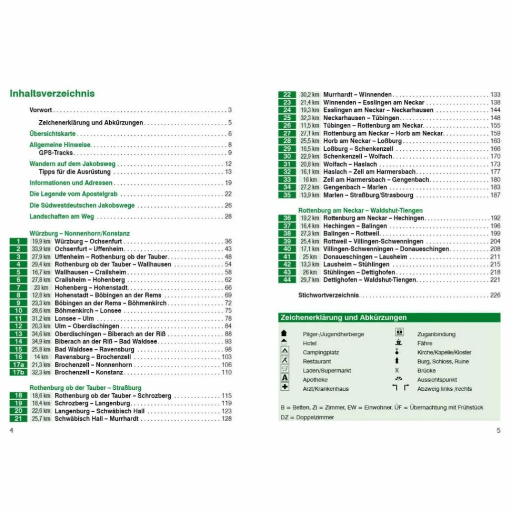 45 Etappen mit GPS-Tracks, 45 Höhenprofile, 50 Wanderkärtchen im Maßstab 1:100.000, sechs Stadtplänen, sowie zwei Übersichtskarten im Maßstab 1:1.800.000 und 1:3.200.000