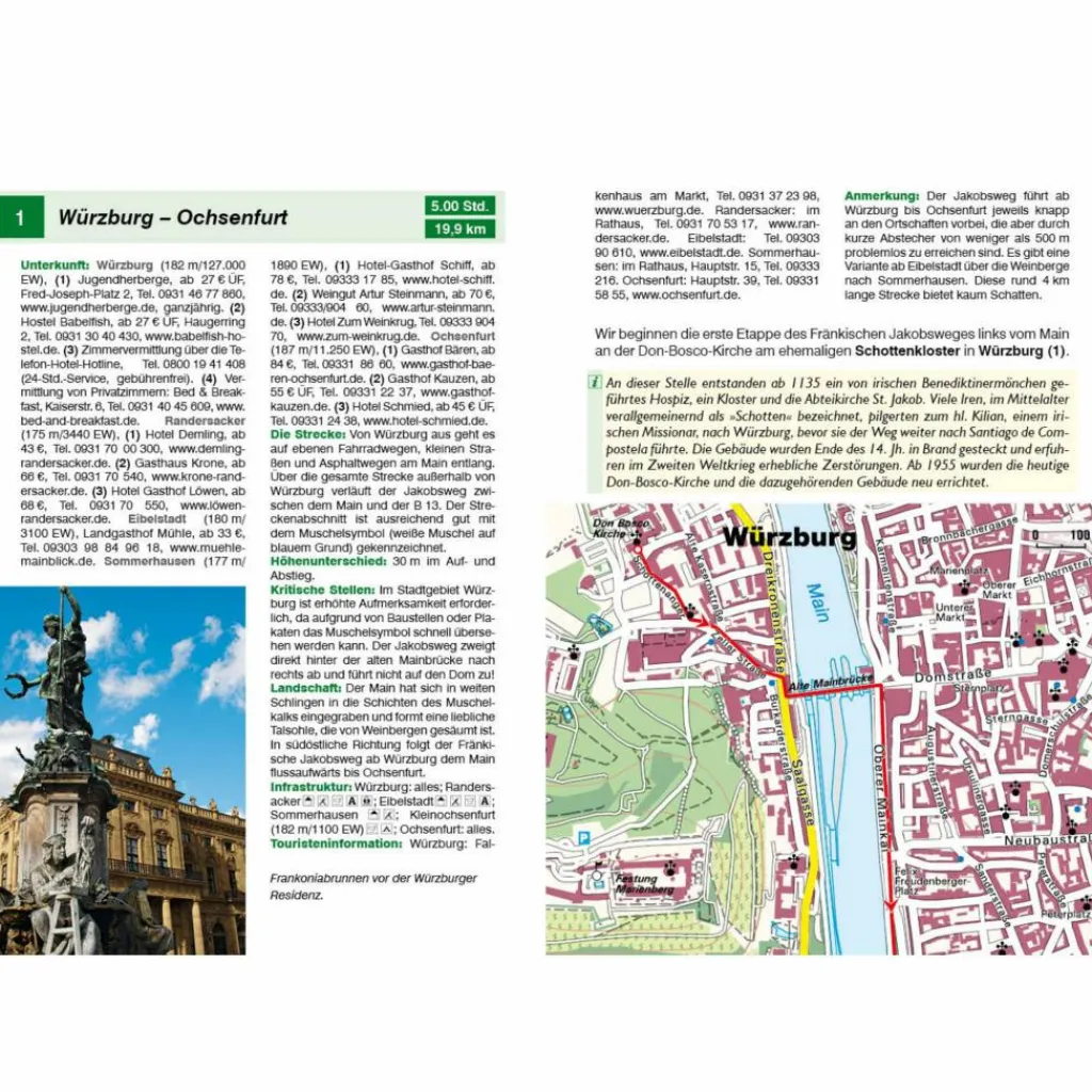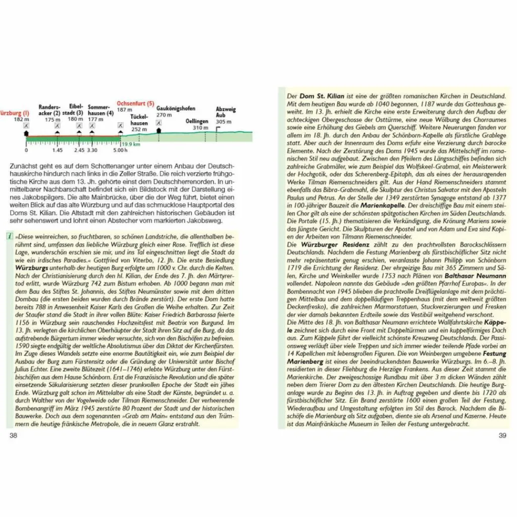 Von Würzburg ausgehend sind drei historische Hauptrouten des Jakobswegs durch Südwestdeutschland beschrieben. Sie enden am Bodensee, in Waldshut-Tiengen am Hochrhein an der Schweizer Grenze bzw. im französischen Straßburg. Die insgesamt 45 Etappen sind eine Einladung, das vermeintlich Bekannte mit Pilgeraugen zu sehen. Auf meist einsamen Wegen und Pfaden lernen die Wanderer das liebliche Maintal und die abwechslungsreiche Hohenloher Ebene ganz neu kennen.