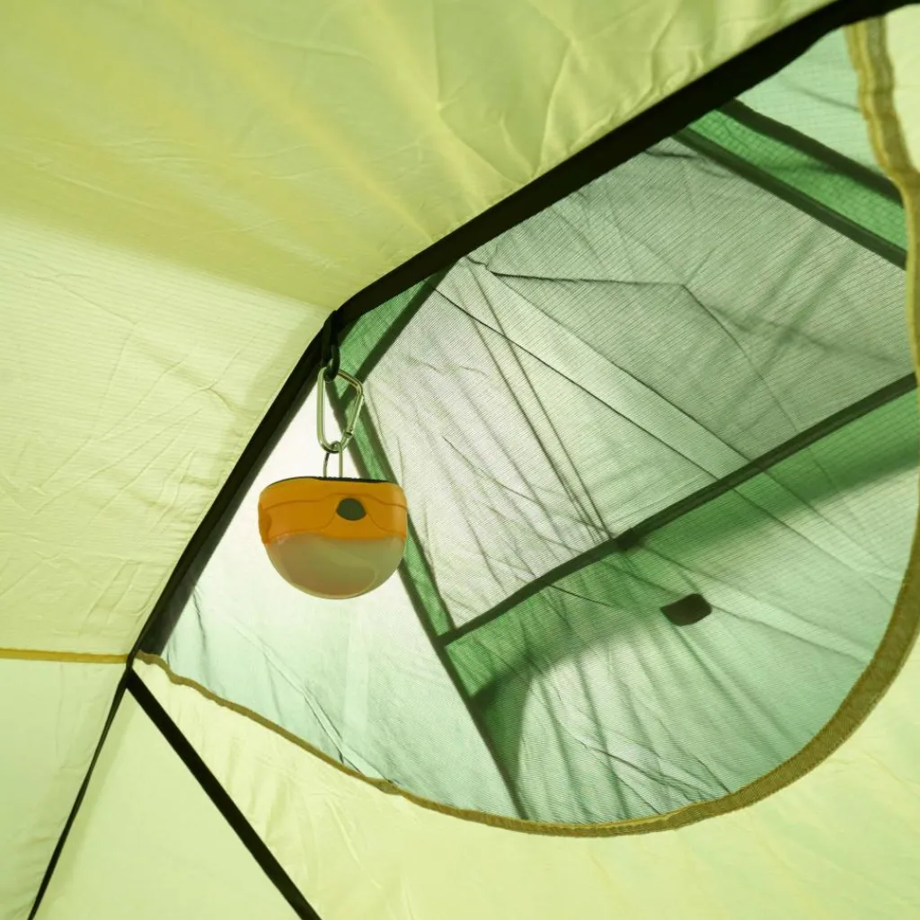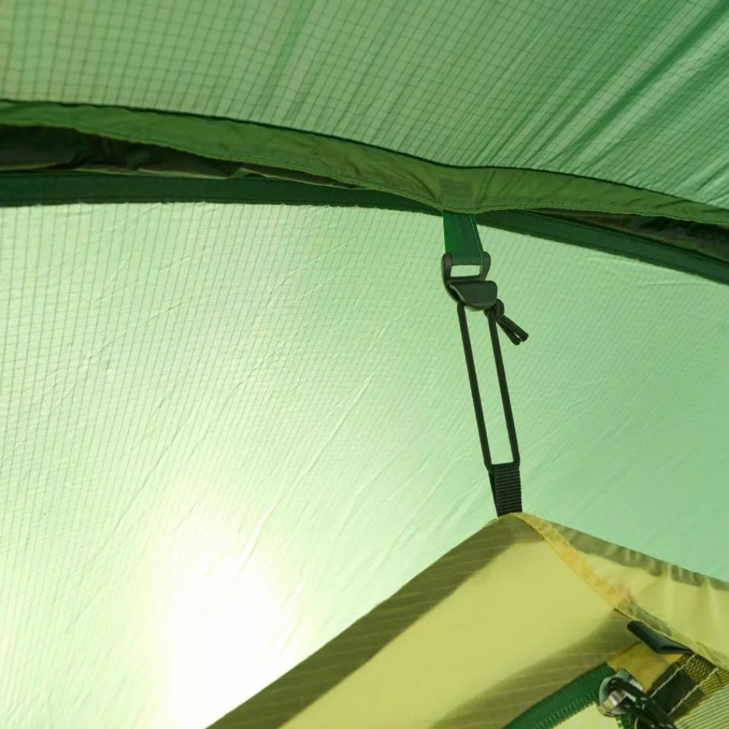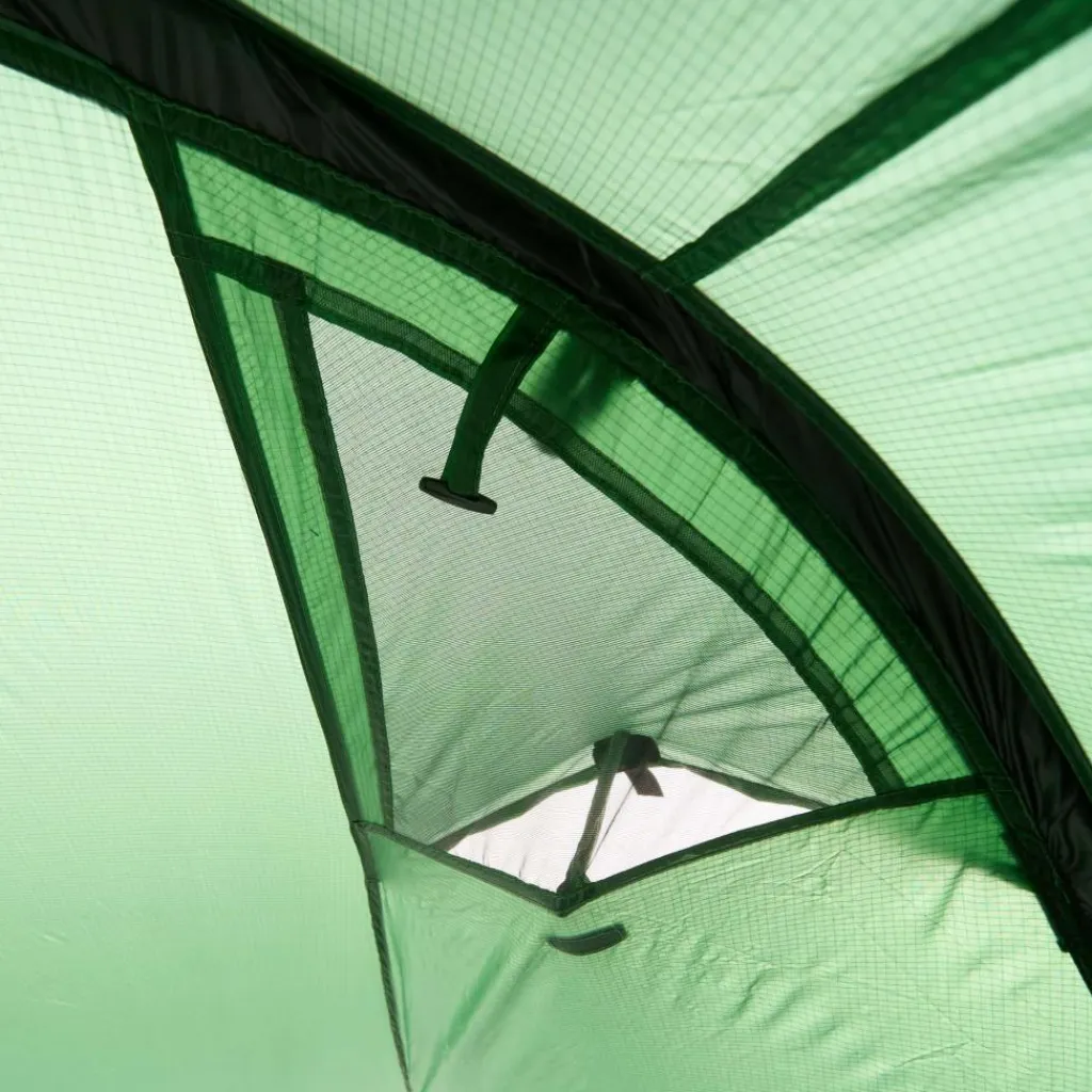 Platz in der Apsis ist trotzdem. Zwei Eingänge ermöglichen dir den Zutritt zum Zelt. Rucksäcke, Taschen und andere Ausrüstungsgegenstände finden hier Platz. In besonders warmen Nächten kannst du die Apsis bis zum ersten Gestängebogen aufrollen und für maximale Belüftung sorgen. Bei schlechtem Wetter sorgen vier aufstellbare Lüfter für den Luftaustausch.