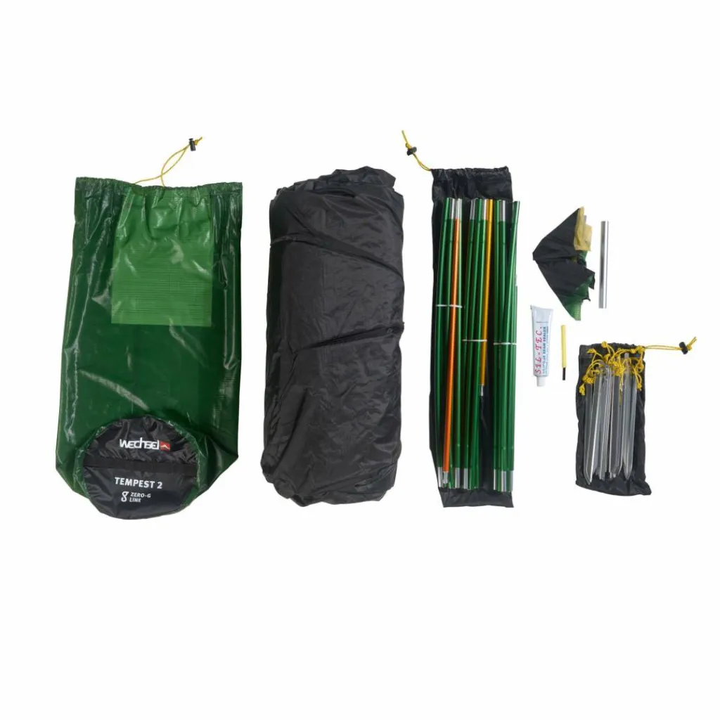 Tempest 2, V-Heringe, Abspannleinen, Reparaturhülse, Gestänge, Reparaturset (Flicken, Kleber), Packbeutel