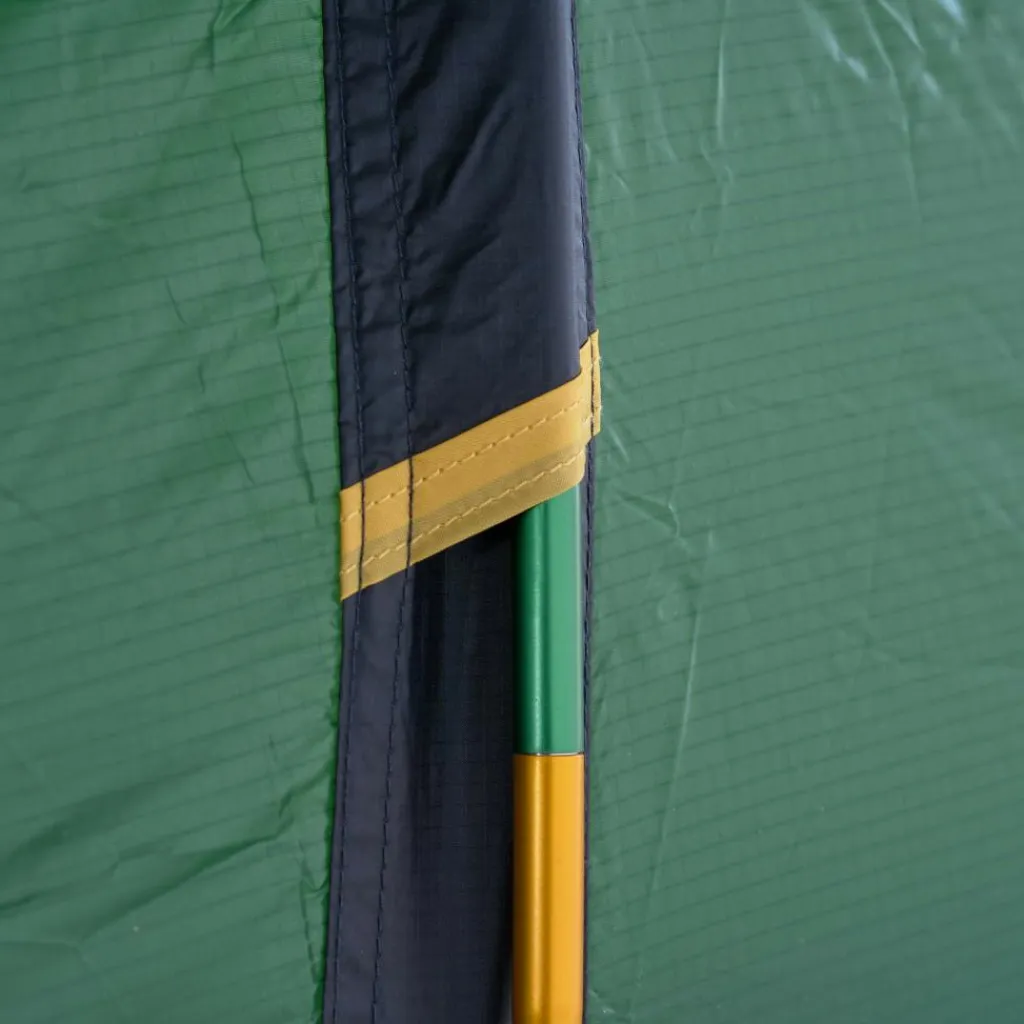 Durch das eingehängte Innenzelt, wird das Zelt in einem Rutsch mit dem Außenzelt aufgebaut. Das Gestänge ist außenliegend und wird durch farbcodierte Gestängekanäle geschoben. Der hintere Gestängebogen ist kürzer, wodurch eine aerodynamische, nach hinten abgeflachte Form entsteht. Diese Seite wird bei Sturm in den Wind gestellt, um wenig Windangriffsfläche zu bieten.