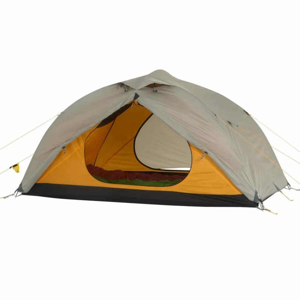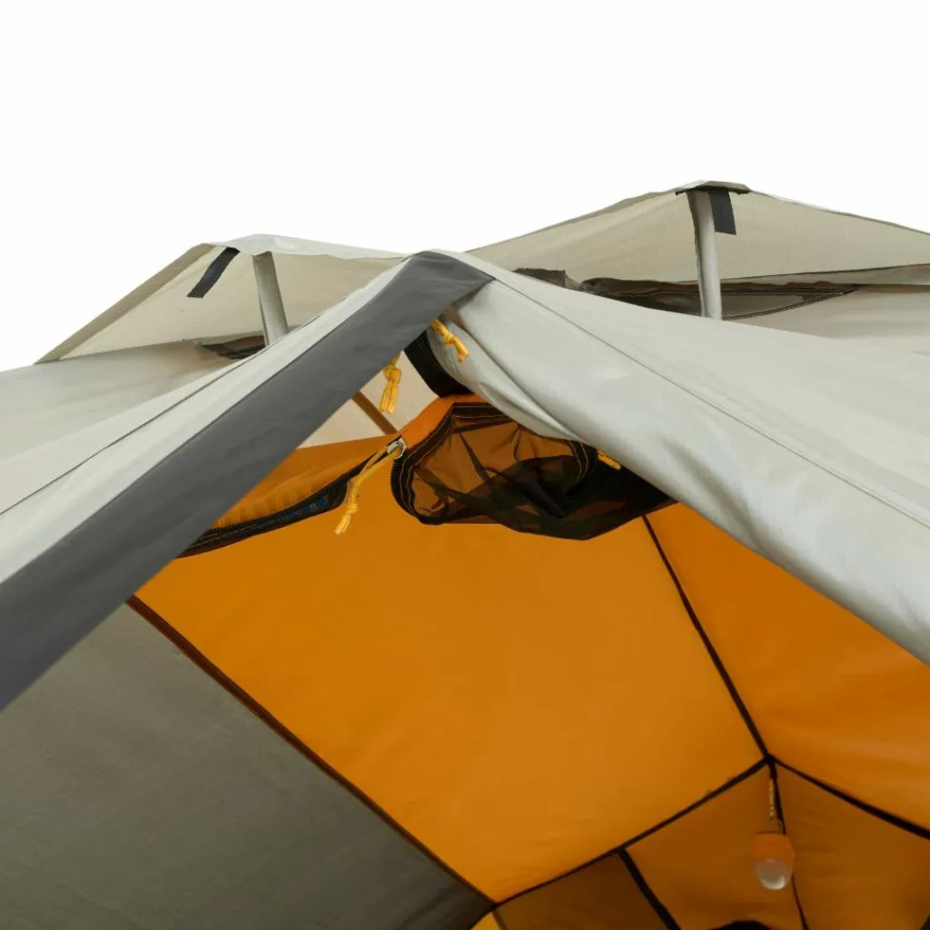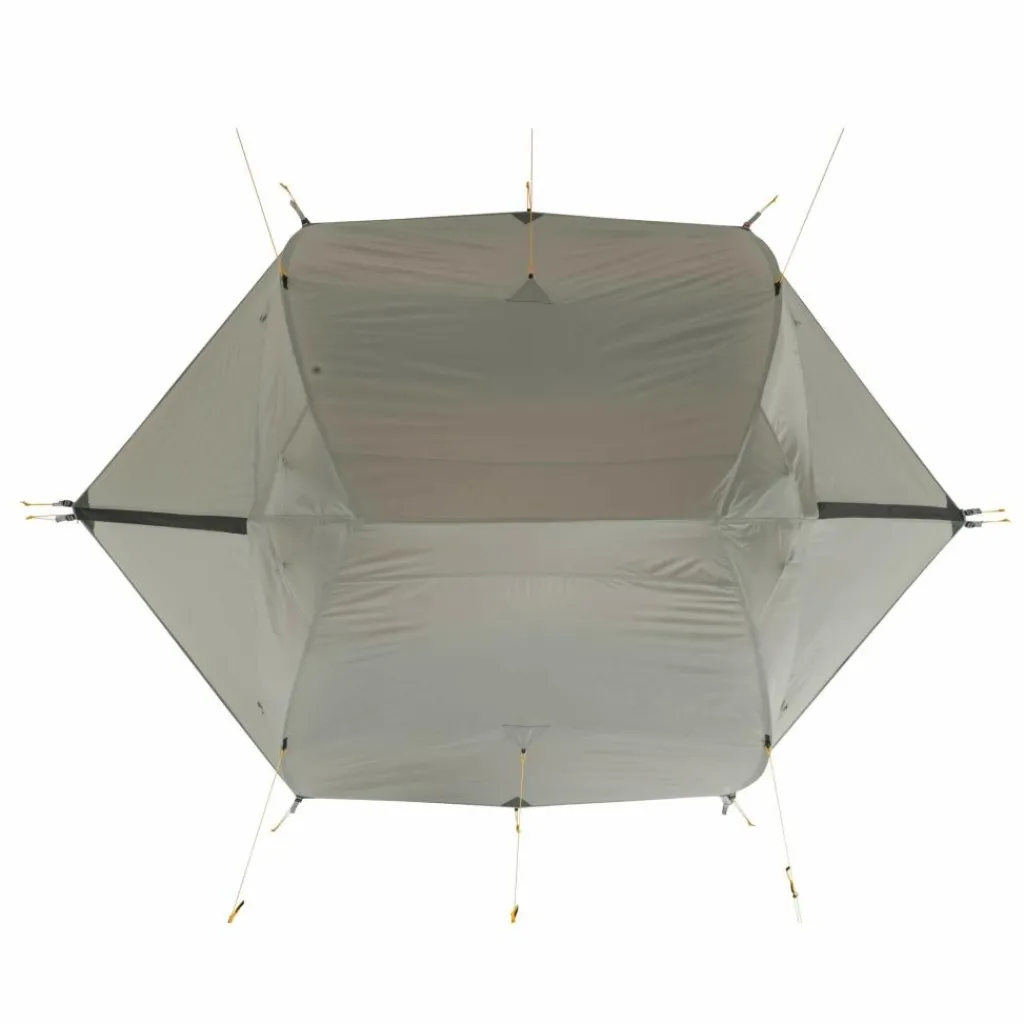 Das Innenzelt bietet ein wohnliches Ambiente. Es hat Platz für bis zu drei Isomatten und sorgt durch das gelbe Innenzeltmaterial für ein warmes Licht. Ausrüstung und Schuhe können in den beiden Apsiden untergebracht werden.