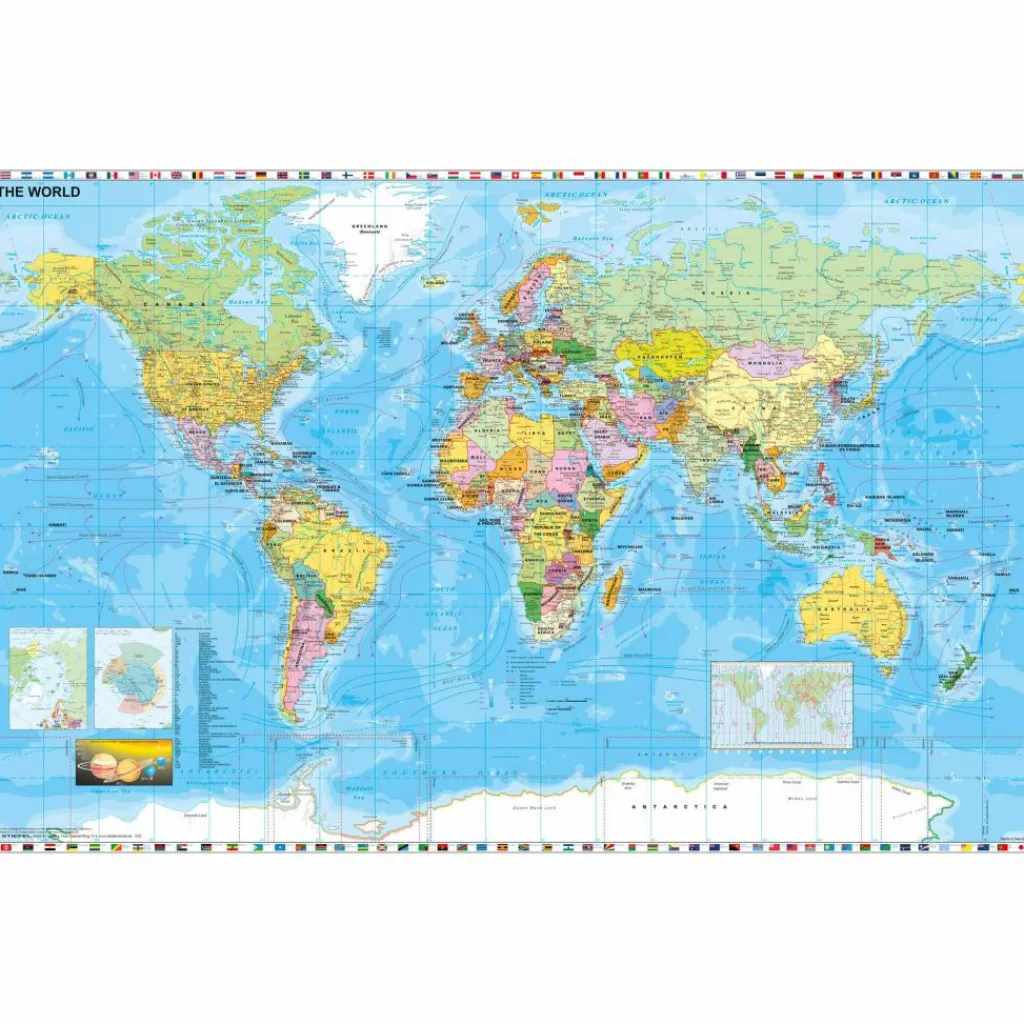 Wandkarte / Poster – beschreib- und abwischbar – extrem reißfest- politische Weltkarte mit Gebirgsrelief und einem sehr hohen Informationsgehalt- Angabe der Meerestiefen- warme und kalte Meeresströmungen- Zeitzonen der Erde und Kontinente- gesonderte Darstellung der Polregionen- mit Flaggen aller Staaten der Erde- bedeutende Seehäfen- internationale Flughäfen- Planeten unseres Sonnensystems- Beschriftung in englischer Sprache