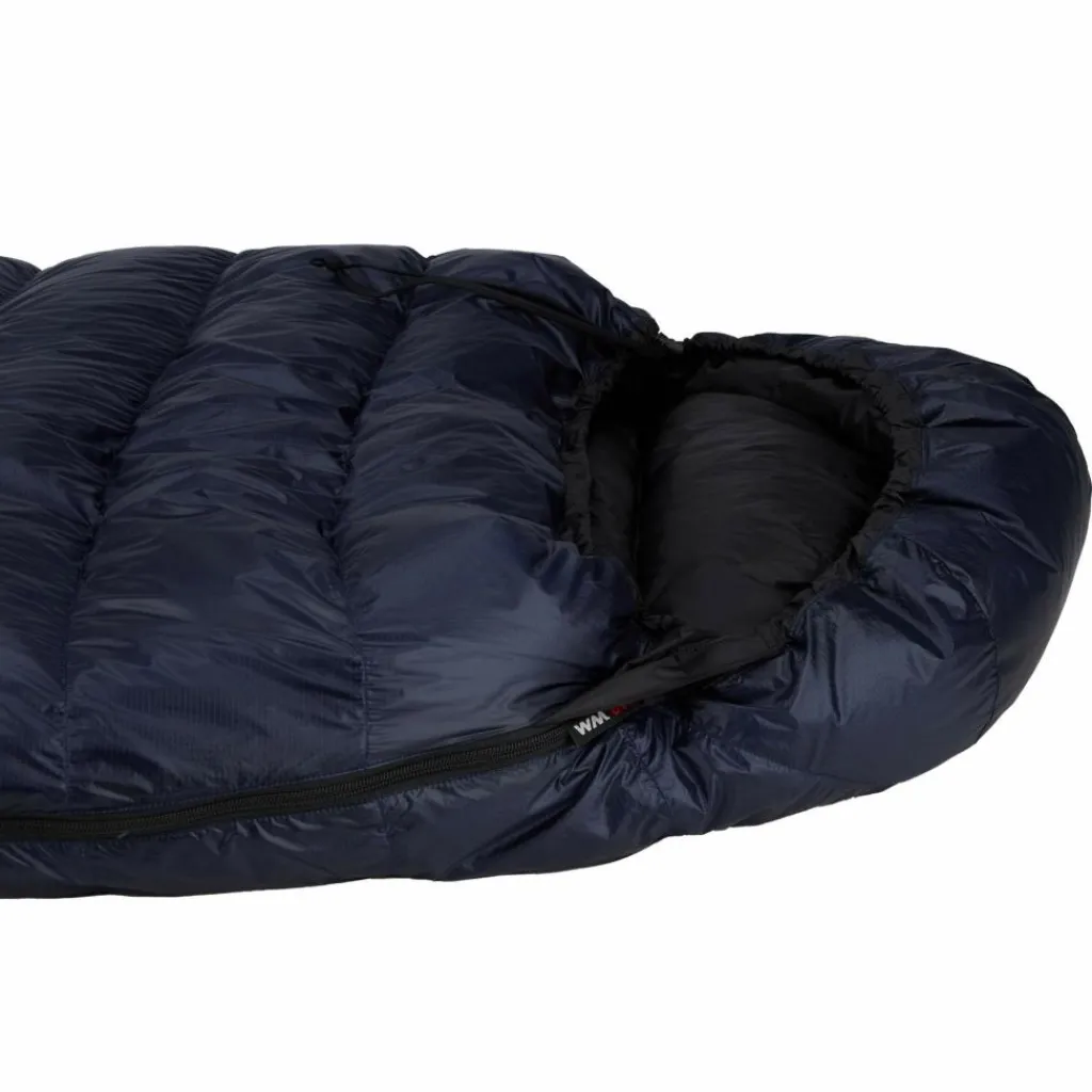 Western Mountaineerings Extremelite-Serie zeichnet sich durch ultraleichte Materialien aus. Das Außenmaterial aus 12D Ripstop Nylon ist daunendicht. Innen kommt 15D Nylon Taffeta zum Einsatz. Es ist herrlich weich und fühlt sich auch direkt auf der Haut angenehm an. Durch die schwarze Farbe heizt es sich schnell auf und trocknet dadurch beim Auslüften schneller.