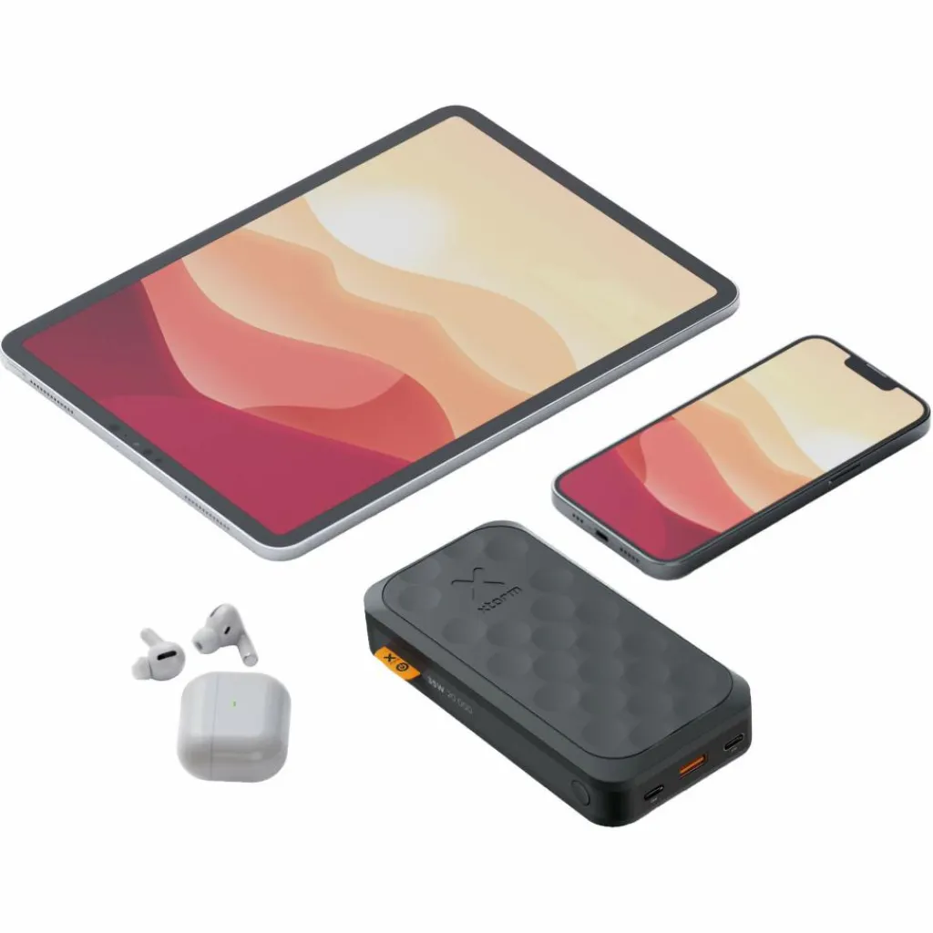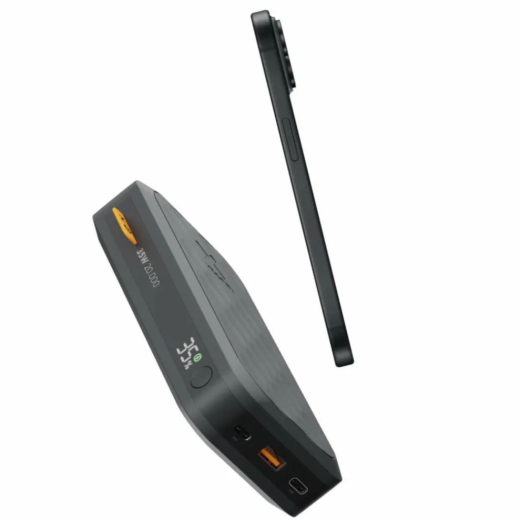 Die handliche Powerbank bietet bis zu 35 W Power am USB-C-Ausgang. Insgesamt stehen drei Anschlüsse zur Verfügung: Neben dem leistungsstarken 35-W-USB-C-PD-Anschluss gibt es einen weiteren 35-W-USB-C-Anschluss und einen 18-W-USB-A-Anschluss. Alle drei Ladeplätze können einzeln oder gleichzeitig genutzt werden.