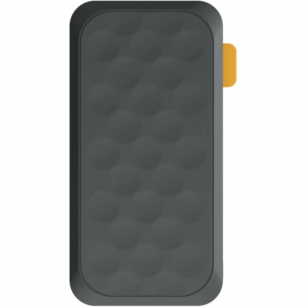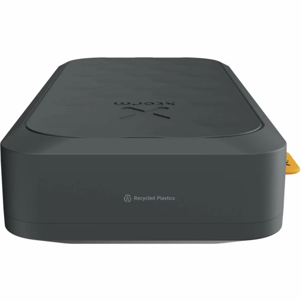 Das Gehäuse besteht größtenteils aus recyceltem Kunststoff und liegt dank der angenehmen Oberflächentextur gut in der Hand. Ein integriertes Digitaldisplay zeigt den Ladezustand der Powerbank präzise in Prozent an.