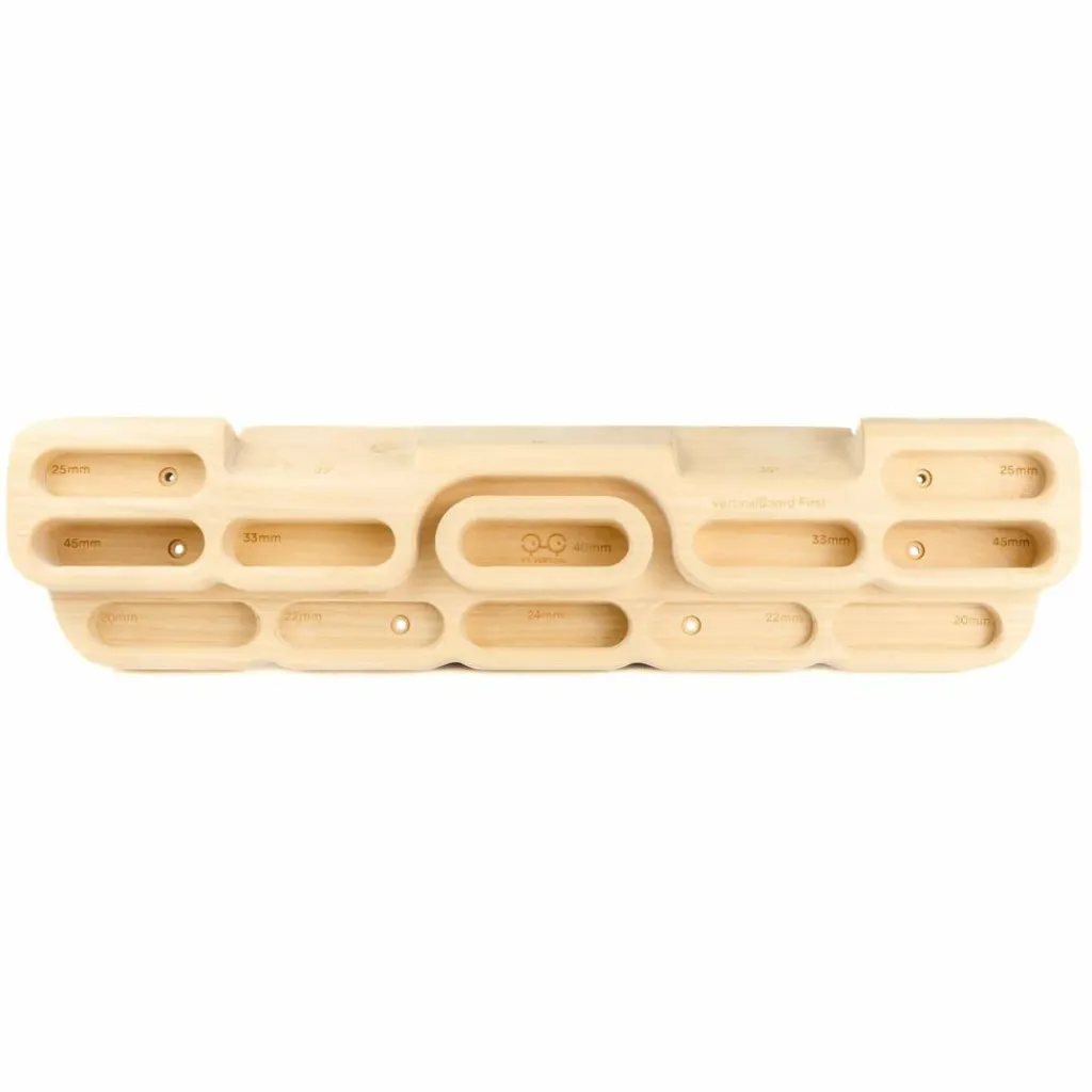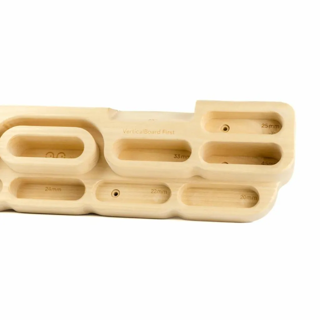 Das Verticalboard First ist ideal für erfahrene Kletterer, die noch stärker werden wollen. Es bietet eine Vielzahl von Griffmöglichkeiten mit verschiedenen Neigungen und Tiefen zwischen 45 und 20 mm.